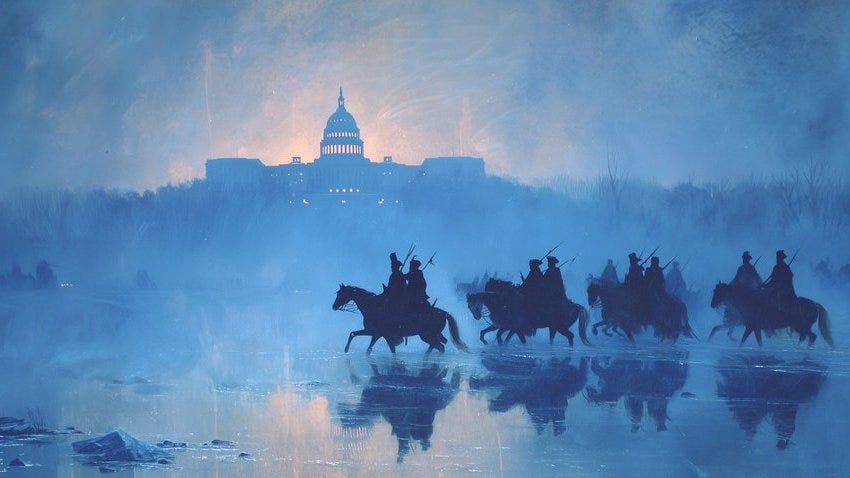 Outside, National Guard vehicles roll down Pennsylvania Avenue.