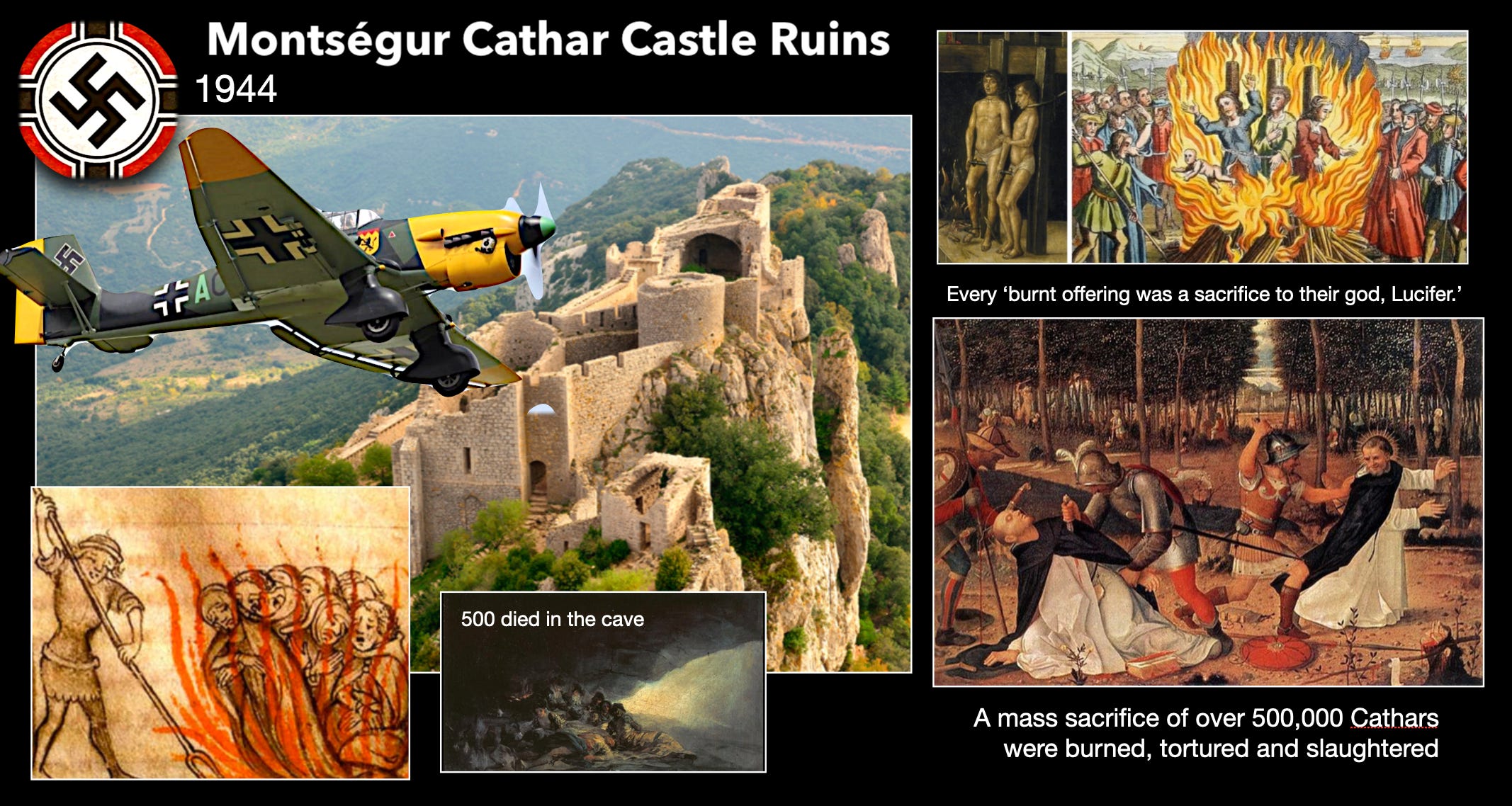 On March 16, 1944 the 700th anniversary of the fall of Montségur and the Cathars, a Nazi plane carrying Alfred Rosenberg flew over the ruins in a swastika pattern to celebrate the death of the Cathars in the cave.