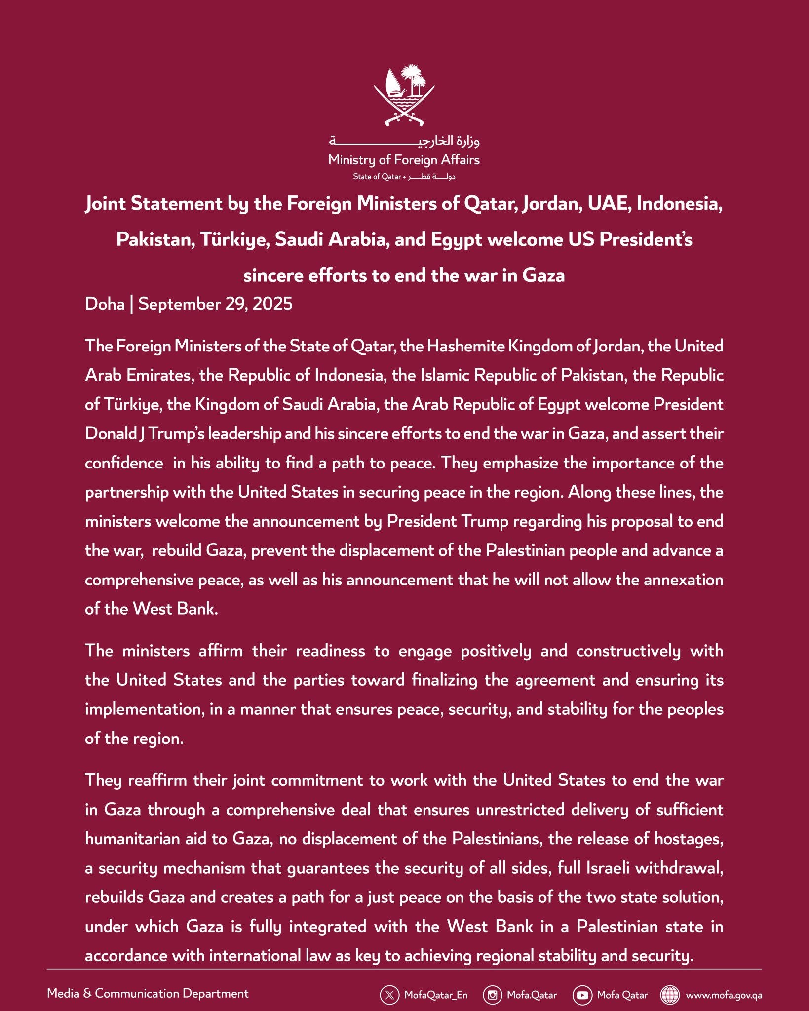 On September 29, the Feast of SAINT MICHAEL the ARCHANGEL… Nine Muslim nations release a Joint Declaration through Qatar’s Ministry of Foreign Affairs…Praising President Trump for his leadership in ending the war in Gaza.