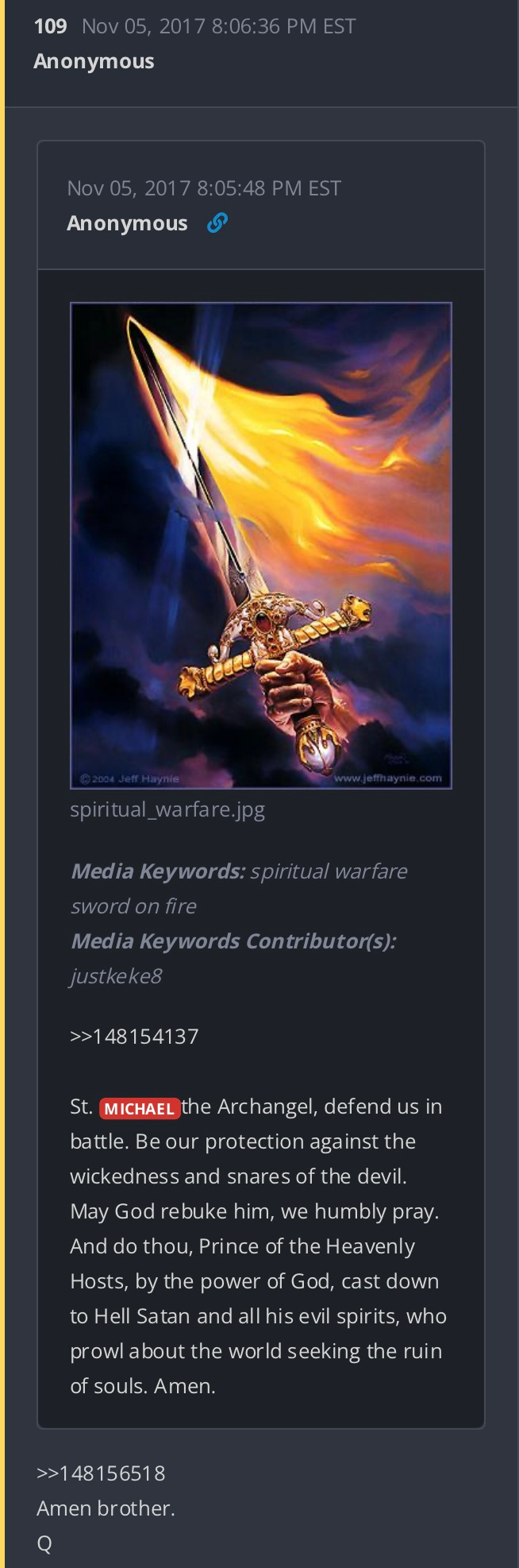 An Anon drops the artwork of the flaming sword and a caption calling on Saint Michael as defender in the war against evil… ✝️ “By the power of God, cast down to Hell Satan and all his evil spirits who prowl about the world seeking the ruin of souls. Amen.” ✝️