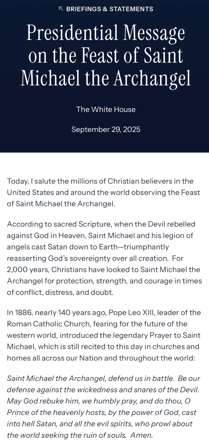And on September 29… the White House made it official: ✝️ “Saint Michael the Archangel, defend us in battle…” ✝️