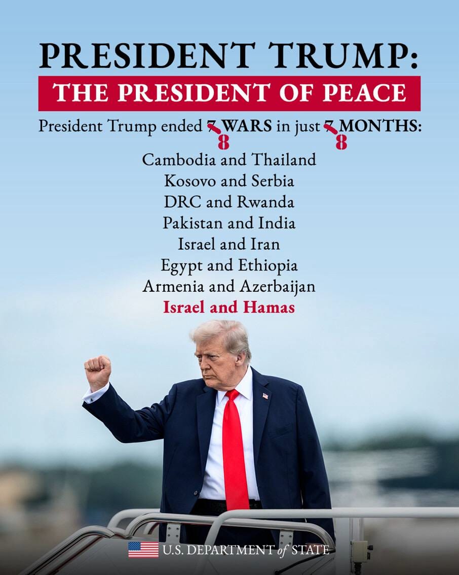 Trump is absolutely on a roll. During the 8 months of his presidency, he ended 8 wars. An incredible job, never accomplished before.