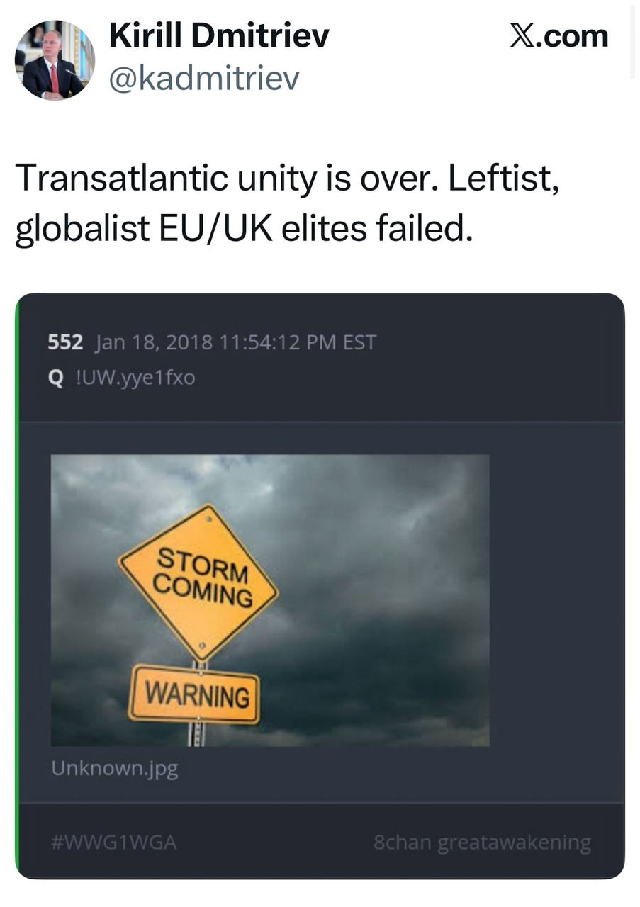 Dmitriev targets the EU and specifically the UK for it’s leftist agenda. His most recent posts call for the Fall of the Starmer Administration (UK), due to it’s link with the Epstein files. On top of that Dmitriev is often using Q posts to stress his points. He is clearly awakening the masses! Very interesting to watch…
