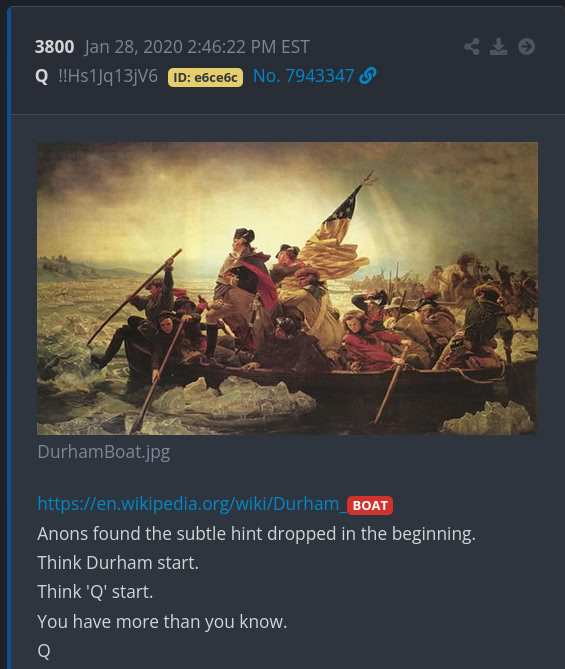 Q post 3800 definitely shows us a boat. The colors of the painting also resemble that of the painting used in Trump’s post.