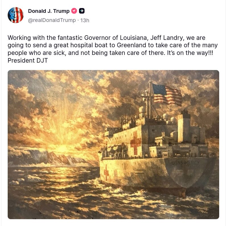 We are going to send a great hospital boat to Greenland to take care of the many people who are sick, and not being taken care of there. It’s on the way!!!” This makes a lot more sense now, doesn’t it?