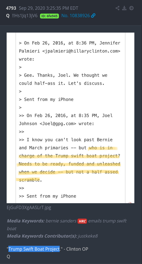 To ‘Swift Boat’ means to execute an unfair or untrue political attack, a smear campaign. We have seen a lot of ‘Swift Boats’ being prepared and executed against President Trump during the last several years. The fact that they discuss it this openly, shows the arrogance they had. The Q phrase: ‘They never thought she would lose..’, describes that perfectly.
