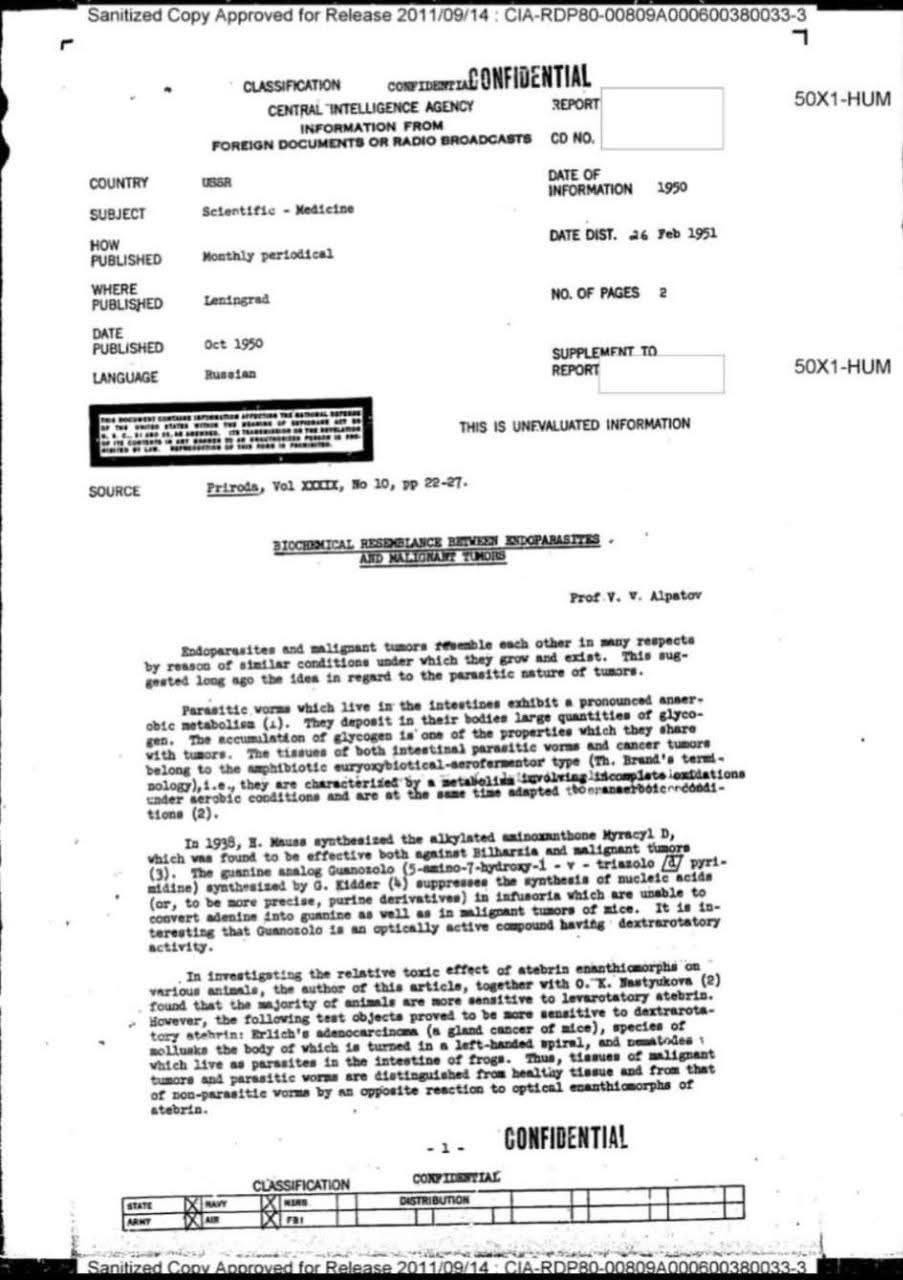 This document, produced in February 1951 and declassified in 2014, summarizes a Soviet scientific paper that examined striking similarities between parasitic worms and cancerous tumors.