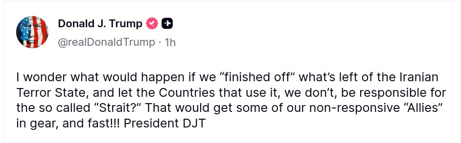 If you have been keeping an eye on my Notes, you will have seen Trump talking about his NATO allies in regard to the Strait of Hormuz. It’s very rare that Trump is so open and clear about his strategy, so let’s start here, shall we?