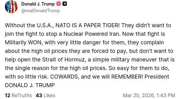 To show the world the truth of Trump’s statement, that the US is always helping its NATO allies, but never gets help in return, Trump called for help to secure the Strait of Hormuz. He even added that this is only in the interest of these allies, as they are dependent of the oil transports, which are now blocked. He didn’t ask them to get involved into the war, only to help secure the Strait.