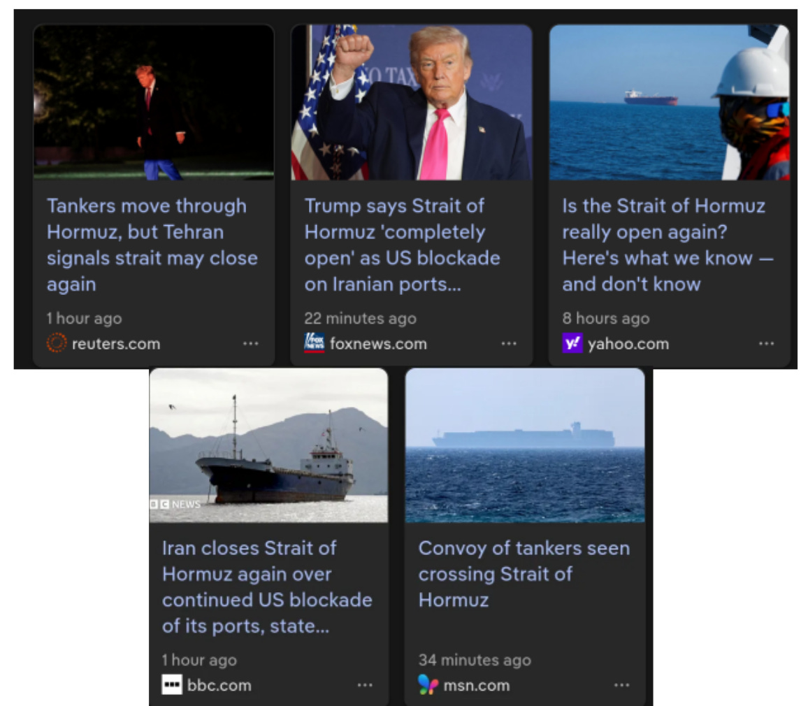 While Trump tells us the Strait of Hormuz is secure and open, Iran tells us the Strait is closed. When trying to find some real news, these contradictionary messages are all we can find: